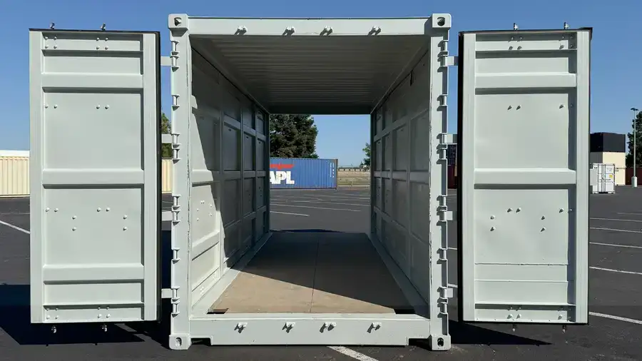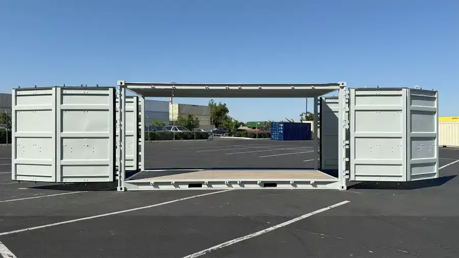 It includes traditional cargo doors on both ends and full-length side opening doors on both sides allowing for maximum accessibility and functionality. 20′ shipping container​ 20 open